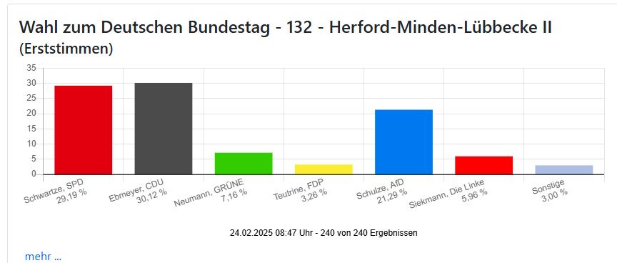 StartRegionBundestagswahlkreis Herford geht knapp an CDU Region Bundestagswahlkreis Herford geht knapp an CDU By Redaktion 24. Februar 2025 0 310 Teilen FacebookTwitterPinterestWhatsApp Joachim Ebmeyer CDU Knapper Wahlsieger im Wahlkreis Herford / MI-LK II ist Joachim Ebmeyer, CDU. TagsBundestagJoachim EbmeyerStefan SchwarzeWahlsieg Teilen FacebookTwitterPinterestWhatsApp Vorheriger ArtikelStimmergebnisse der Bundestagswahl in LöhneNächster ArtikelTod vor der Löhner Polizeiwache Redaktion Kommentieren Sie den Artikel Antwort abbrechen Kommentar: Bitte geben Sie Ihren Kommentar ein! Name:* Bitte geben Sie hier Ihren Namen ein E-Mail:* Sie haben eine falsche E-Mail-Adresse eingegeben! Bitte geben Sie hier Ihre E-Mail-Adresse ein Website: Speichern Sie meinen Namen, meine E-Mail-Adresse und meine Website für den nächsten Kommentar in diesem Browser.