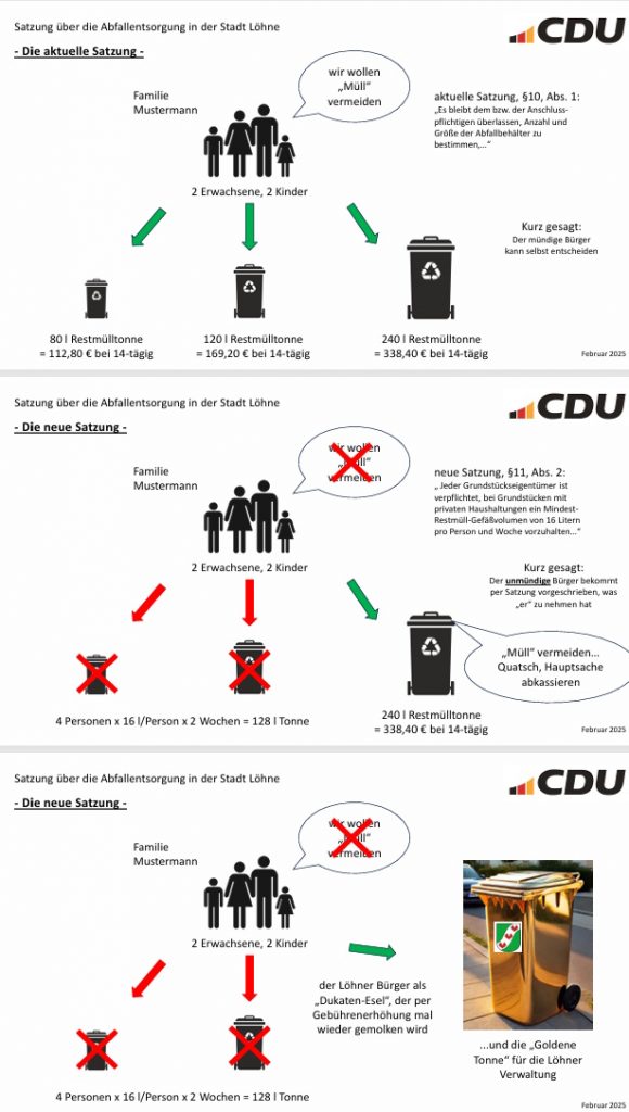 Eine ganz andere „Rechnung“ machte CDU-Fraktionsvorsitzender Prof. Maik Büssing auf: Er veranschaulichte, wie die neue Satzung dazu führe, dass zahlreiche Löhner Haushalte demnächst neue und größere Tonnen ordern müssten, um den geänderten Vorgaben der Satzung zu entsprechen: