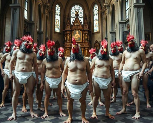 Drei tote, geköpfte Hähnchen in Babywindeln, mit denen zwei halbnackte Männer und eine Frau vor dem Altar tanzten, begleitet von einer umgetexteten Version des Liedes „Live is Life“ (nun „Fleisch ist Fleisch“), bildeten den Kern der „Kunst-Aktion“.