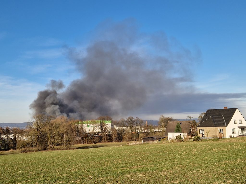 Löhne, 5. März 2025 – Am heutigen Dienstagnachmittag gegen 15:45 Uhr wurde die Hauptwache der Feuerwehr über einen Großbrand im Gewerbegebiet Scheidkamp in Löhne informiert. Eine hohe schwarze Rauchsäule, die kilometerweit zu sehen war, stieg über das Gelände der Firma Relux Rohstoffe auf, einem Unternehmen in unmittelbarer Nähe des Logistikzentrums Hermes. Feuerwehren aus Löhne, Herford und Bünde wurden alarmiert und sind derzeit mit einem Großeinsatz vor Ort, um die Flammen unter Kontrolle zu bringen.