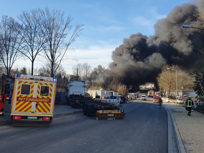 Löhne, 5. März 2025 – Am heutigen Dienstagnachmittag gegen 15:45 Uhr wurde die Hauptwache der Feuerwehr über einen Großbrand im Gewerbegebiet Scheidkamp in Löhne informiert. Eine hohe schwarze Rauchsäule, die kilometerweit zu sehen war, stieg über das Gelände der Firma Relux Rohstoffe auf, einem Unternehmen in unmittelbarer Nähe des Logistikzentrums Hermes. Feuerwehren aus Löhne, Herford und Bünde wurden alarmiert und sind derzeit mit einem Großeinsatz vor Ort, um die Flammen unter Kontrolle zu bringen.