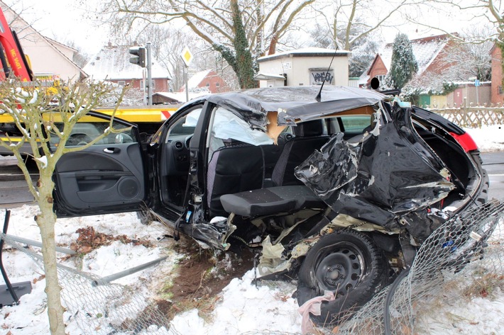 Der leichtverletzte Fahrer konnte sich selbstständig aus dem Autowrack befreien und flüchtete anschließend zu Fuß. Der Flüchtige konnte im Rahmen einer Fahndung aufgespürt und festgenommen werden. Hierbei leistete er Widerstand, wobei sich ein Beamter leichte Verletzungen zuzog. Bei dem zunächst Unbekannten handelte es sich um einen Mann aus Bremerhaven. Da sich der Verdacht auf einen Betäubungsmittelkonsum ergab, wurde der 45-Jährige zwecks Blutprobe dem Johannes Wesling Klinikum zugeführt.