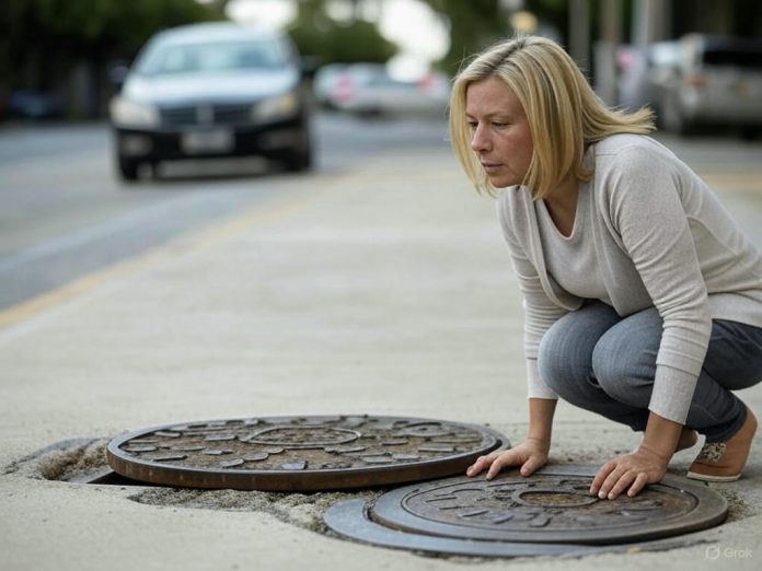 Als die Frau ihr Auto verließ, sah sie, dass der Deckel eines Abwasserkanals von bisher Unbekannten aus seiner ursprünglichen Position gehoben worden war und auf die Fahrbahn gelegt wurde.