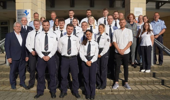 (um) Insgesamt hat die Polizei Herford dieses Jahr 19 neu in die Behörde versetzte Kolleginnen und Kollegen zugeteilt bekommen. Die Behördenleitung mit Landrat Jürgen Müller begrüßte jede in die Kreispolizeibehörde versetzte Kollegin und jeden Kollegen im Großen Sitzungssaal des Kreises Herford im Rahmen einer Feierstunde. „Wir freuen uns dieses Jahr ganz besonders auf Sie und auf die damit verbundene Unterstützung und Verstärkung der Kreispolizeibehörde.“ betonte der Behördenleiter Landrat Jürgen Müller. Die sieben Beamtinnen und 12 Beamte werden im Wachdienst sowie bei der Kriminalpolizei eingesetzt. Ein Kollege kehrt als erfahrener Kriminalbeamter in den Ermittlungsdienst der Direktion Kriminalität zurück. Die Personalzuweisung wirkt den jährlichen Pensionierungen und Versetzungen entgegen. Die meisten Beamtinnen und Beamten sind junge Absolventen der Hochschule für Polizei und öffentliche Verwaltung NRW. Dabei sind aber auch erfahrene Beamtinnen und mehrere erfahrene Beamte, die sich in ihren Heimatkreis bzw. zu ihrem Wohnort haben versetzen lassen. [Polizei HF, um, ots]