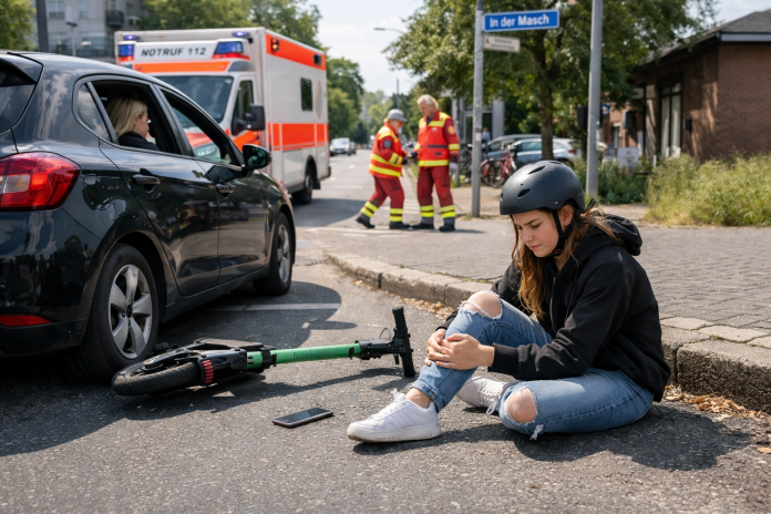 Löhne (MS) – eine 17-jährige Fahrerin eines E-Scooters wurde bei einem Verkehrsunfall am Freitagmittag (06.03.) leicht am Bein verletzt. Die Löhnerin befuhr kurz vor 14 Uhr die Schützenstraße in Fahrtrichtung Bahnhofstraße und wollte an der Einmündung In der Masch den Gehweg überqueren.