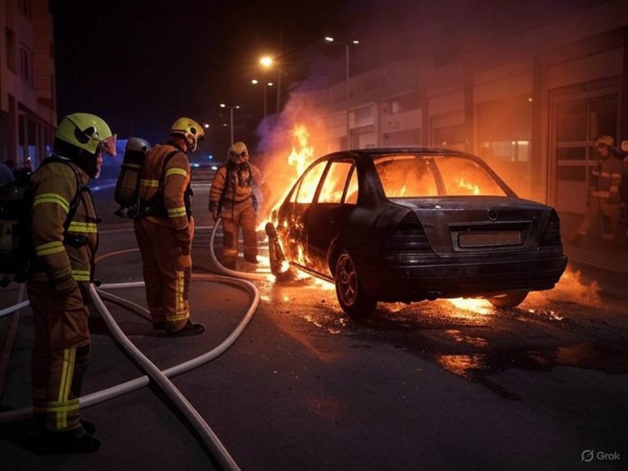 Schnell wurde deutlich, dass ein am Fahrbahnrand geparkter Mercedes-Benz in Brand geraten war. Das Feuer breitete sich aus und zog auch die Asphaltdecke der Straße und die Vegetation eines Grünstreifens in Mitleidenschaft.