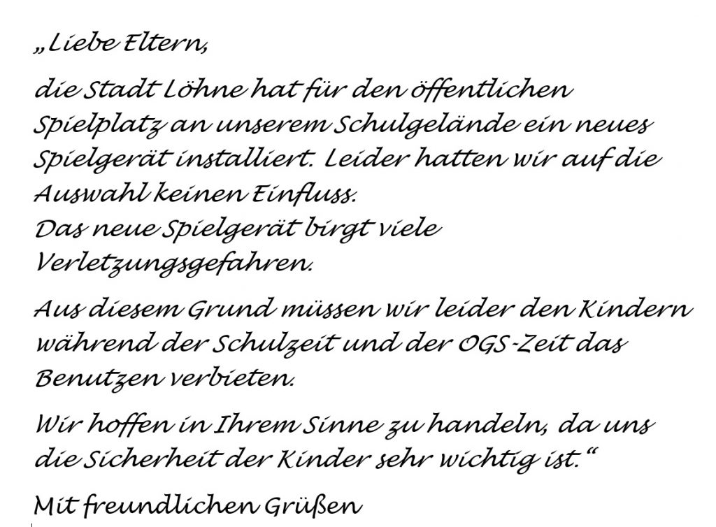 Die LBA hatte sich erkundigt, weshalb die Leitung der Ev. Grundschule Gohfeld ein Brandbrief verschickte, in dem den Grundschülern die Nutzung der von der Stadt frisch angeschafften Spielgeräte untersagt wurde und deren Eltern über diesen Sachverhalt informiert wurden.