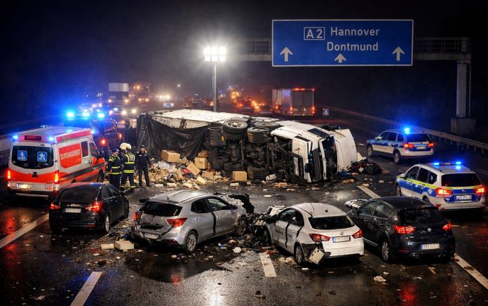 Vlotho – Auf der Autobahn A2 kam es am Montagabend, 29. Dezember 2025, zu einem schweren Verkehrsunfall in Höhe der Anschlussstelle Vlotho. In Fahrtrichtung Bielefeld kollidierten ein Möbeltransporter sowie vier Pkw miteinander. Insgesamt wurden acht Menschen verletzt, darunter auch Kinder.