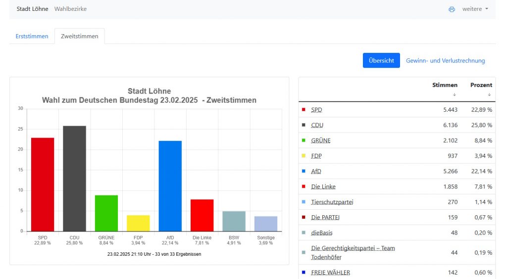 Bei der Auszählung der Zweitstimmen für die Bundestagswahl ergab sich für Löhne folgendes Ergebnis: